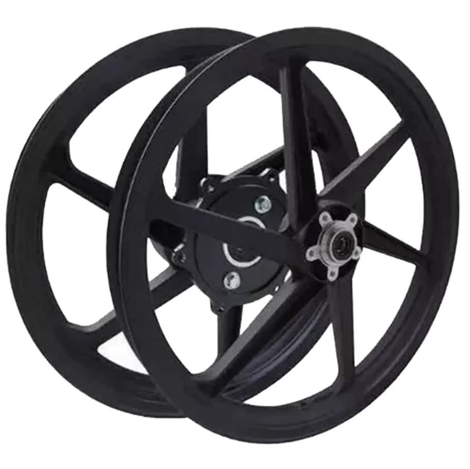 O jogo de rodas de liga leve BHD/Scud (6 pontas) para Honda NXR 125/150 Bros ESD (freio a disco) é fabricado em alumínio de alta resistência, ideal para uso urbano. Inclui rolamentos, buchas e retentores, oferecendo encaixe preciso sem adaptações, com aro 19" (dianteiro) e 17" (traseiro) na cor preta.