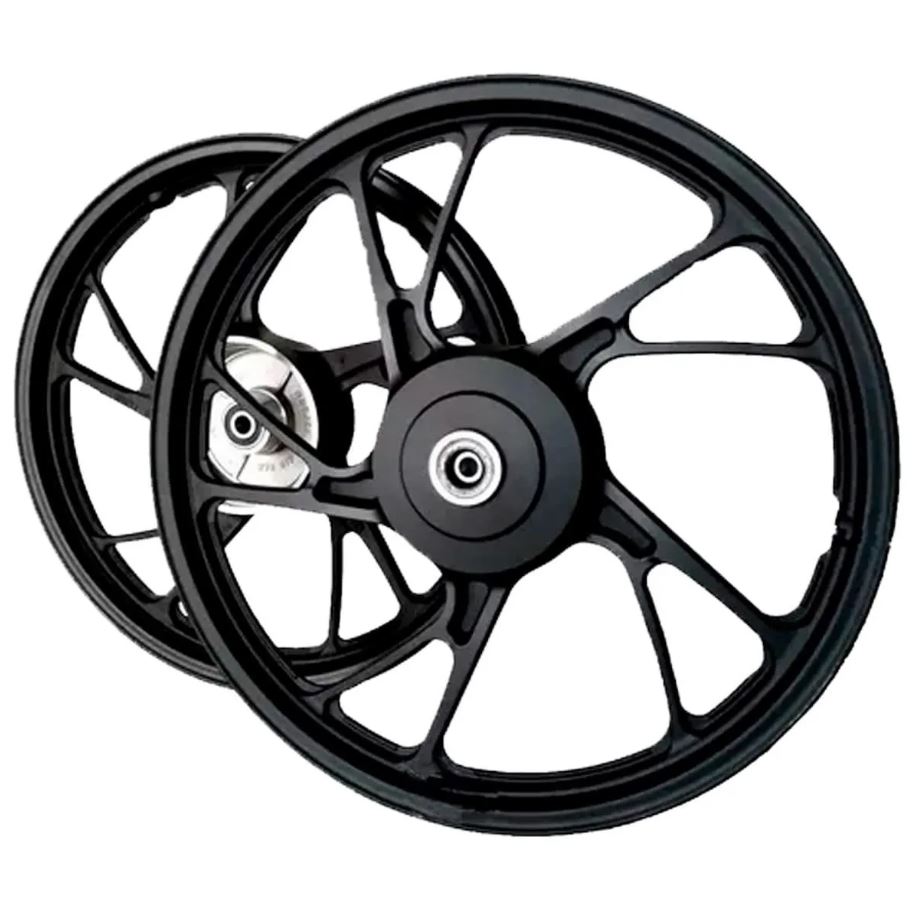 O Jogo de Rodas Liga Leve BHD (modelo Pé de Galinha) para Honda Titan 150 (2004-2013) e Start 160, na cor preta, é projetado para freios a tambor (lona) em ambas as rodas. Fabricadas em liga de alumínio de alta resistência, possuem aro 18, incluem rolamentos e suportam uso de pneus com ou sem câmara.