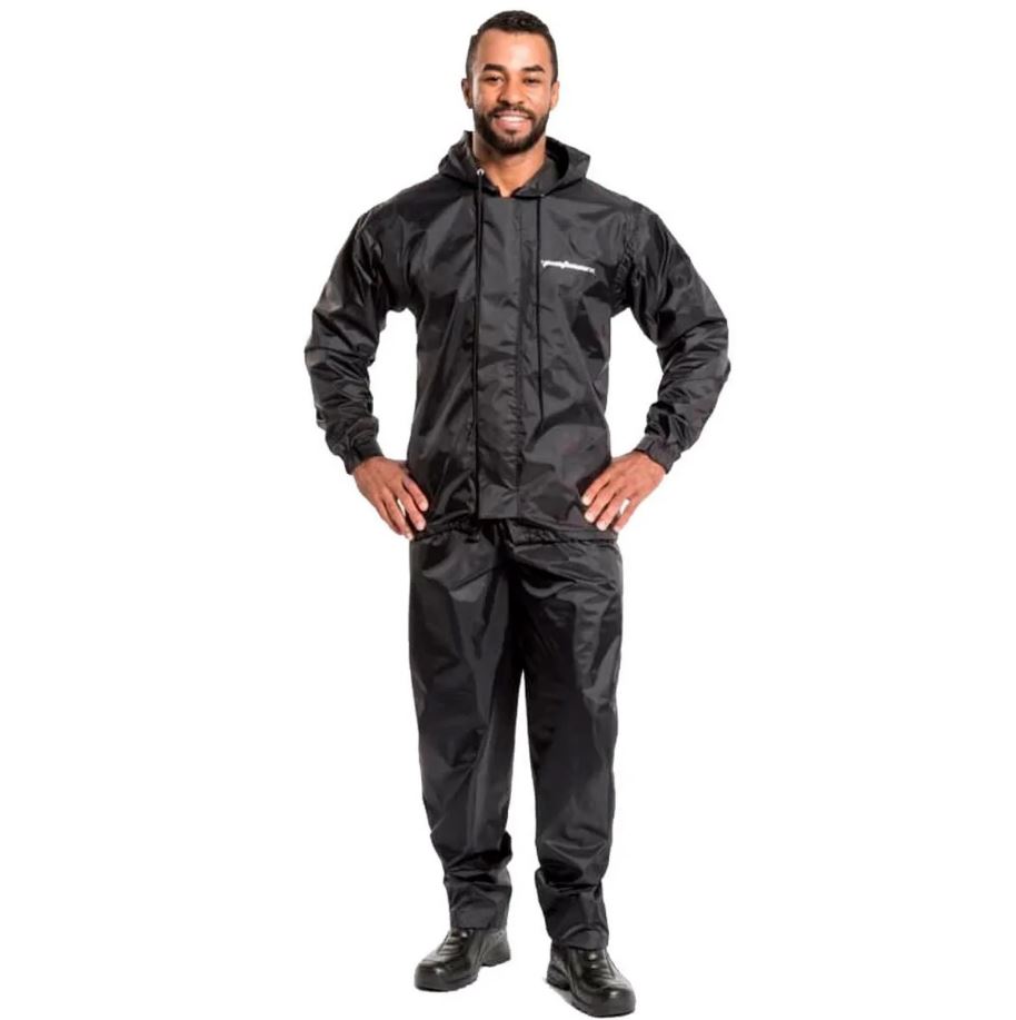 Jaqueta com abertura para mochila, bolso interno, cintura ajustada com elástico e punhos com elástico e velcro. Fechamento frontal com zíper e velcro. Refletivo nas costas e na calça. Com Capuz.